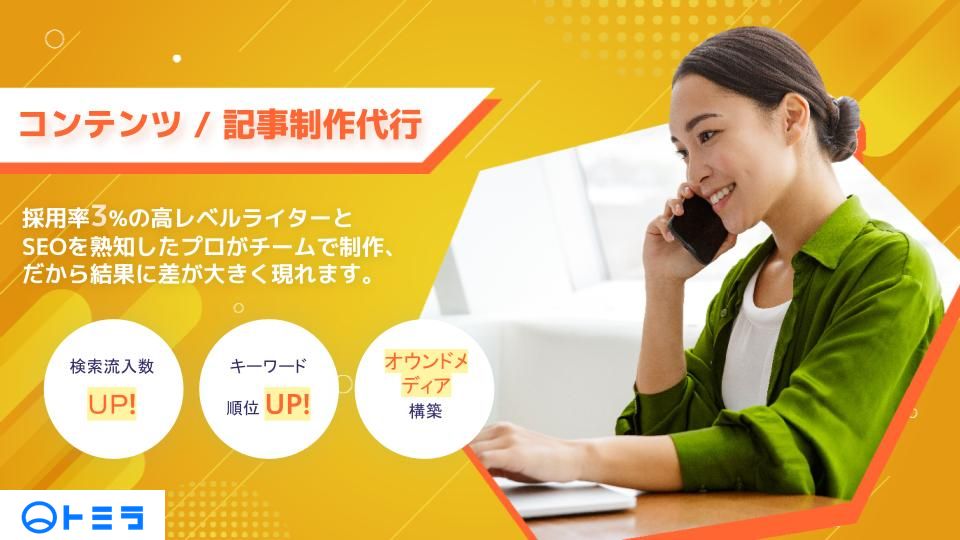 トミラのコンテンツ・記事制作代行サービスは、Googleのアルゴリズムやガイドラインを熟知したプロフェッショナルが、タイトルやタグの最適化、内部リンクの設定を行いながら、ユーザーにとって読みやすい記事を執筆します。さらに、キーワードの分析や選定から記事作成までを一貫して依頼することが可能です。SEOに強い記事を制作したいと考えている方におすすめのサービス資料になります。