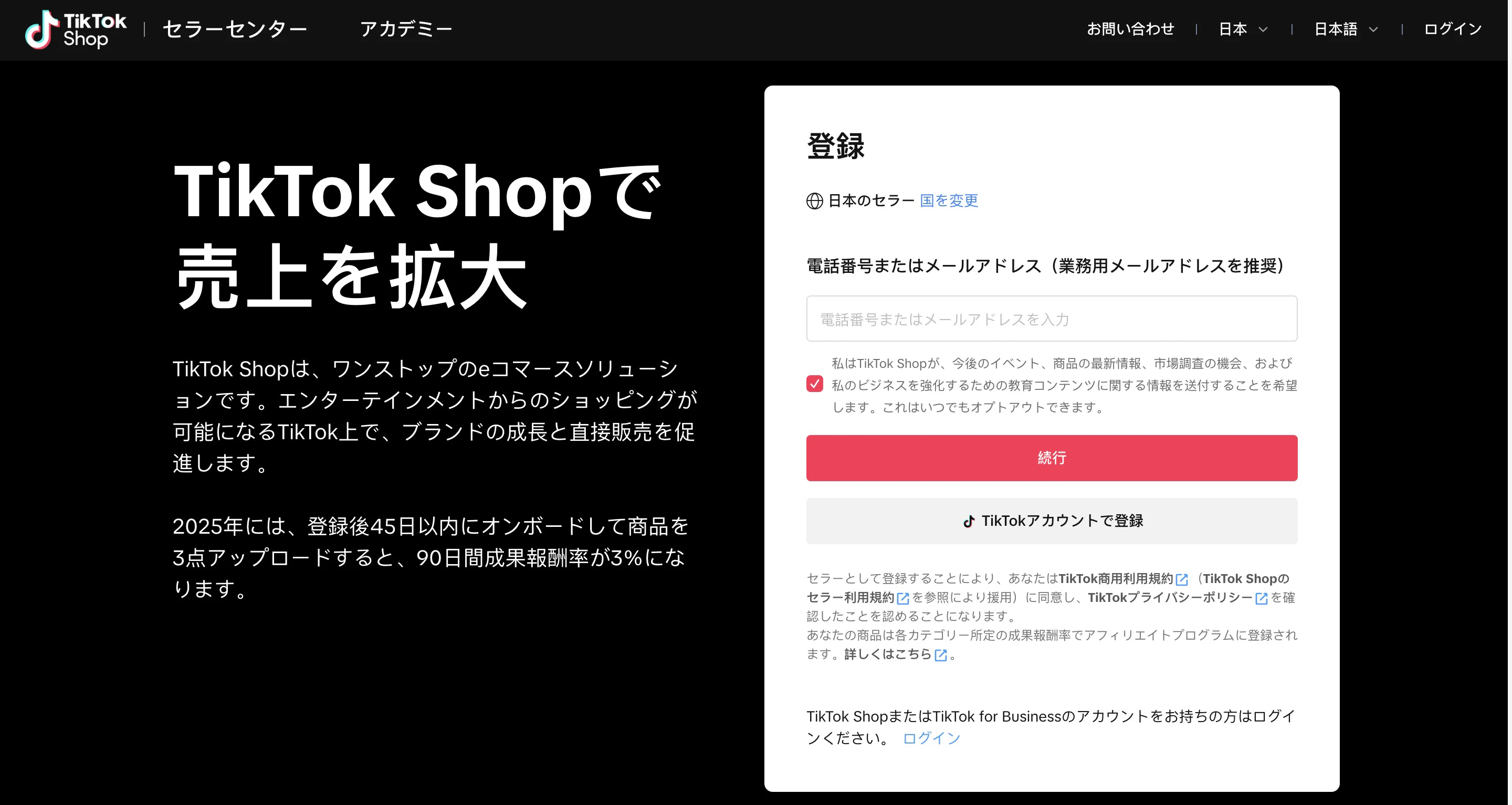 まず、TikTok Shopの出店者用管理画面「TikTok Seller Center(https://seller-jp.tiktok.com/account/register/)」にアクセスし、アカウントを開設します。
