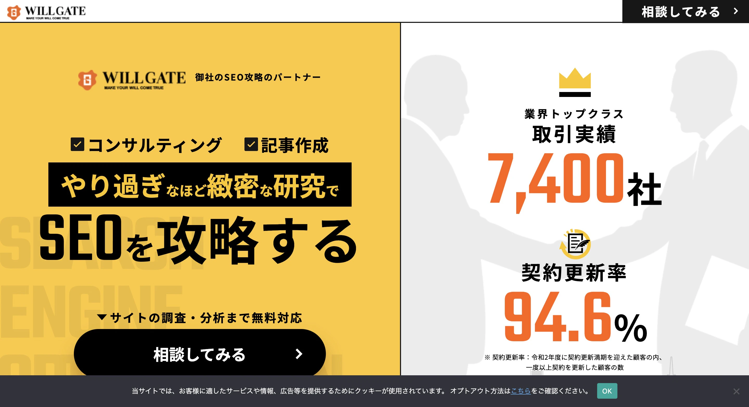 WILLGATEは、SEOコンサルティングや記事作成サービスを提供しています。SEOの専門家が最新の情報やノウハウをもとに、クライアントのニーズに合わせた戦略を立案します。