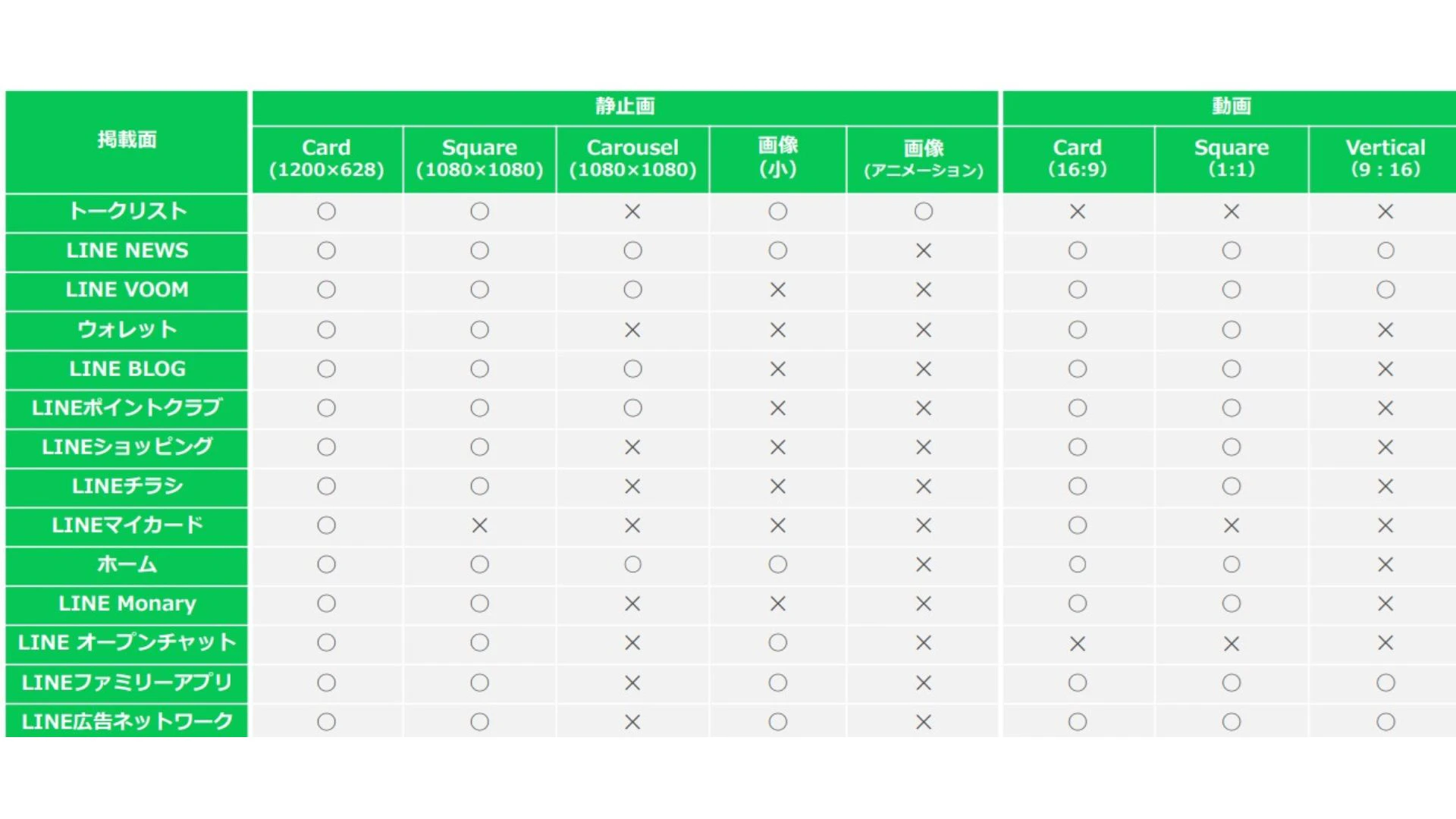 横長の形式で静止画(1200×628)もしくは動画(16:9)で掲載できます。トークリストからタイムラインまで、ほとんどの配信面に対応しているオーソドックスな広告フォーマットです。トークリストに動画掲載できないこと以外は、全て掲載可能なため多くのユーザーに閲覧してもらえる点がメリットです。