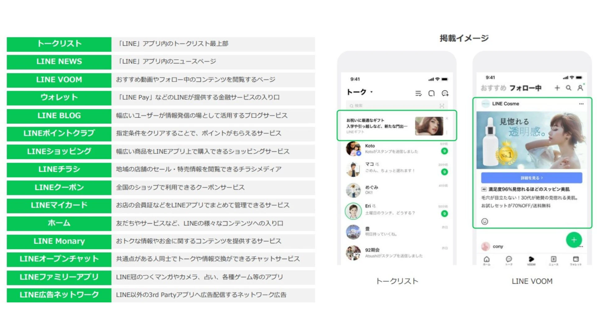 LINE広告では、多くの配信面に広告を配信できます。多くの配信面があるからこそ、幅広い世代や多くのユーザーが広告閲覧できます。以下の配信面にLINE広告を配信できます。