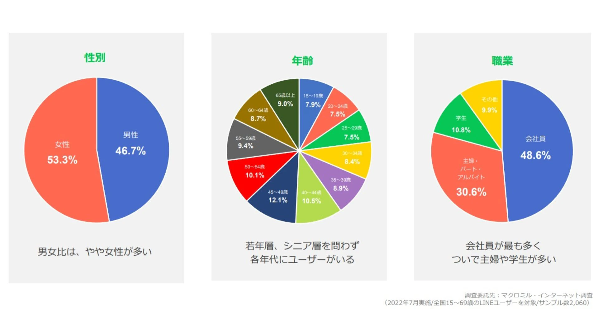 また、ユーザー分布は非常にバランスが良く、年齢も各年代ほとんど均等、男女比も半々、居住地の分布も人口分布比率に近い状態となっています。