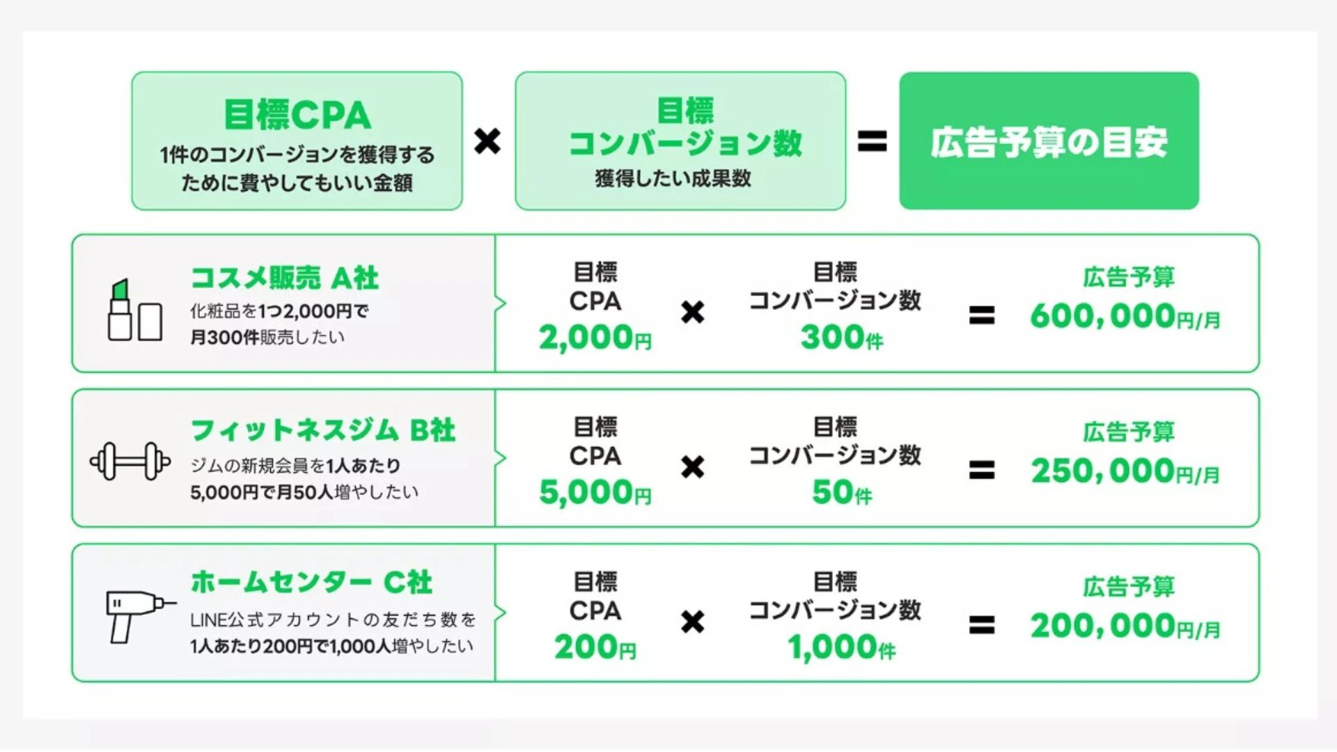 広告予算の目安=目標CPA×目標コンバージョン数