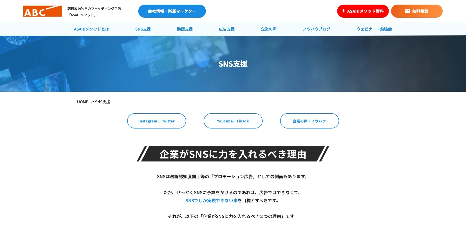 ASAHIメソッドは、InstagramやX(旧twitter)、YouTube、TikTokといったSNSの支援サービスを提供しています。「クチコミを強化できる」、「ファンを創ることができる」ことをSNS運用の一番のメリットとし、これらを達成するための効果的な施策を提案することができます。