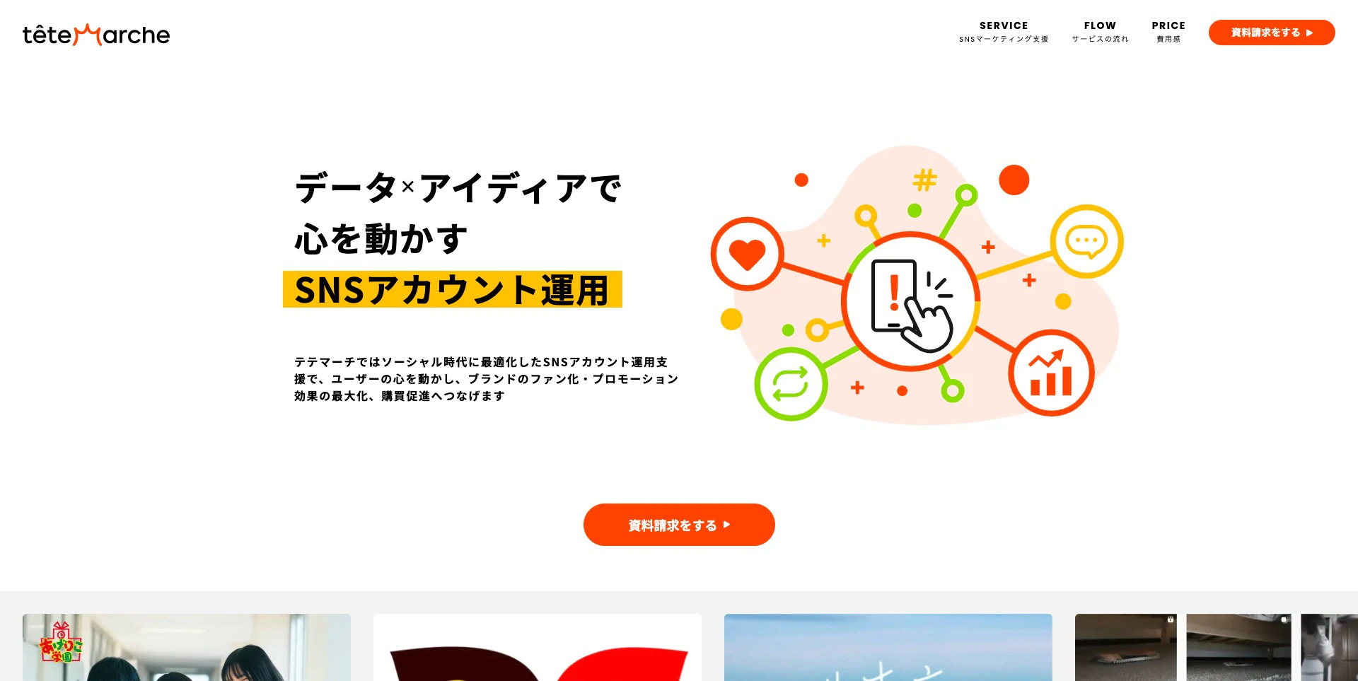 詳細 | tete marche(テテマーチ)は、戦略の策定からコンテンツの制作、運用業務と分析までトータルでサポートするSNS運用支援サービスです。設計から運用までのトータルサポートはもちろん、コンテンツの企画提案を任せることも可能。自社のSNS運用状況に合わせて幅広い使い方ができます。