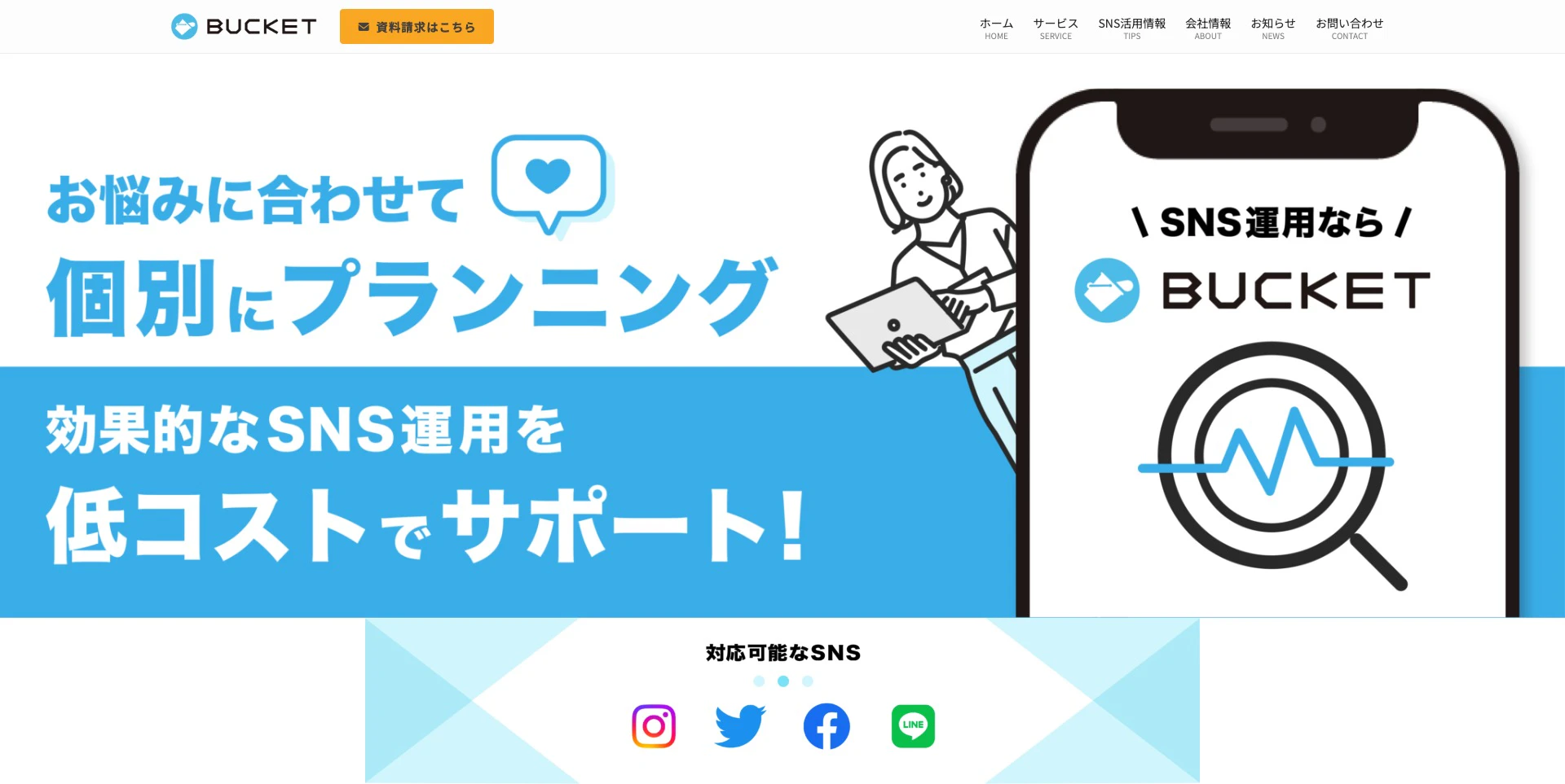 詳細 | バケットはSNS運用代行を通しながら、クライアントのビジネス成功へ向けてSNSを効果的に活用するためのアイディアと実行体制を提供。継続的に改善する「運用力」を得意としています。およそ200にも及び企業アカウントを支援し、500万人以上のファンをフォロワーを増加させて実績も強みのサービスです。