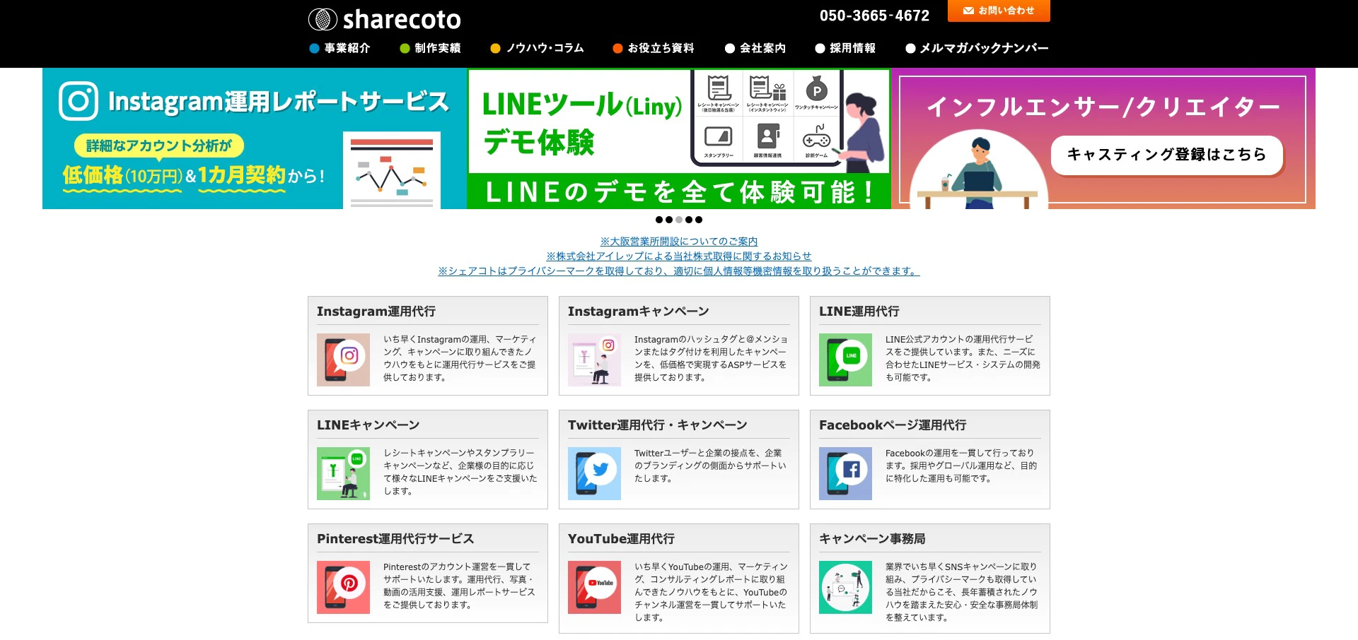 シェアコトは、SNSを活用したプロモーションやキャンペーンを、企画・デザイン・開発・運用までワンストップで支援しています。主に、Facebook、X(旧twitter)、LINE、Instagram、YouTube、PinterestなどSNS運用代行や、インフルエンサーキャスティングサービスを提供しています。