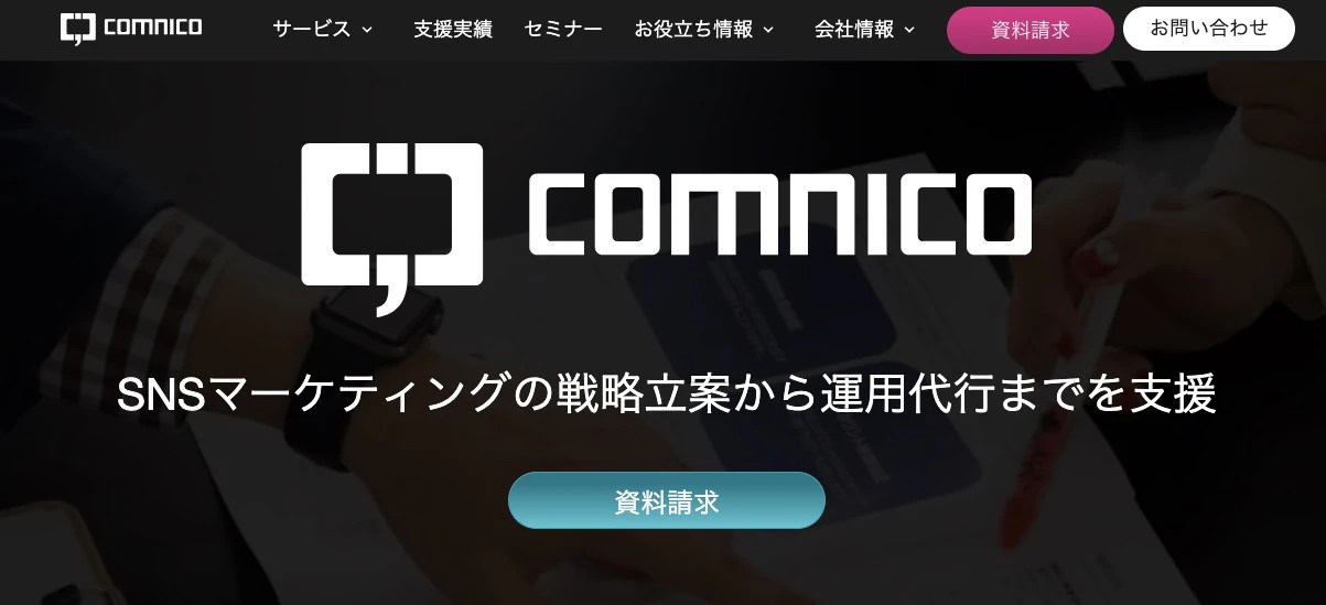 詳細 | Comnicoは、クライアントのSNS運用課題に応じて最適なサービスを提案し、プランニングや運用代行、効果検証までをワンストップで支援するサービスです。2008年より事業を開始したComnicoは、これまでに約1,000にもおよぶアカウントの運用実績があり、大手企業とも多数取引を実施、安定した運用体制を実現しています。