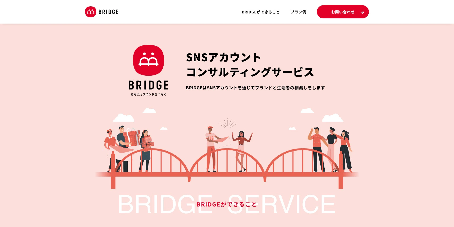 詳細 | BRIDGEは、SNSの企画制作、投稿、運用、効果測定、キャンペーン制作、ファンサポートにいたるまでワンストップでサポートするSNS運用代行サービスです。ソーシャルリスニング活用した生活者視点の投稿、グループ会社と連携したサポート体制、プラットフォームの特性に合わせた運用プランなどを提案、支援しています。