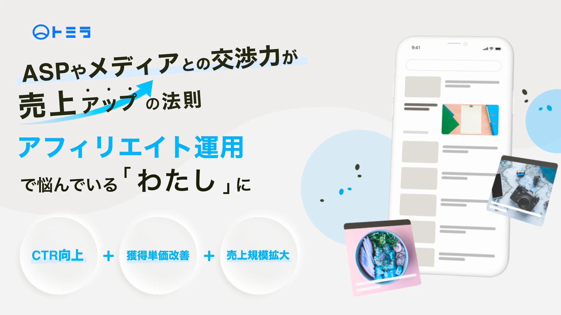 ASP(アフィリエイトサービスの提供者)との直接契約でなく、間にトミラを挟むことで、弊社が持つ独自のネットワークを駆使し、ASPまたその先のアフィリエイター(メディア)を動かし、クライアントに最適なメディアの掲載面を確保できます。