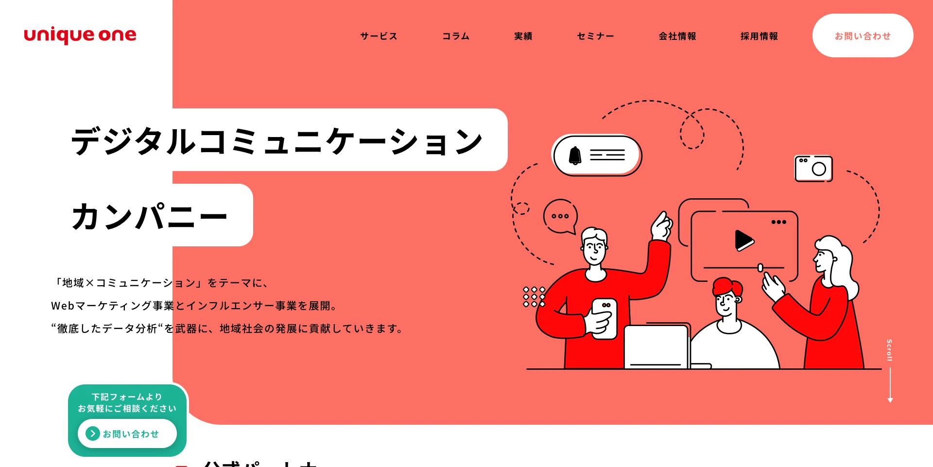 株式会社ユニークワンは、Webマーケティング事業を提供するデジタルコミュニケーションカンパニーです。Web広告や動画制作を行なっています。主に、リスティング広告やFacebook広告、Instagram広告、Twitter広告、LINE広告、Pinterest広告、TikTok広告、YouTube広告を取り扱っています。また、WebCMからYouTuber風の動画まで、ターゲットに合わせた動画制作も可能です。