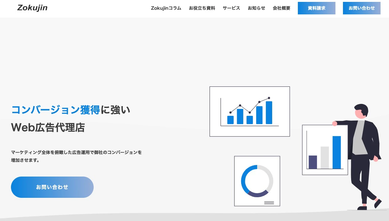 Zokujinは、コンバージョン獲得にこだわりを持ったWeb広告代理店です。マーケティング全体を俯瞰した運用が強みとしてあります。主に、リスティング広告やFacebook広告、Instagram広告、Twitter広告、LINE広告、Pinterest広告、TikTok広告などの広告媒体を取り扱っています。