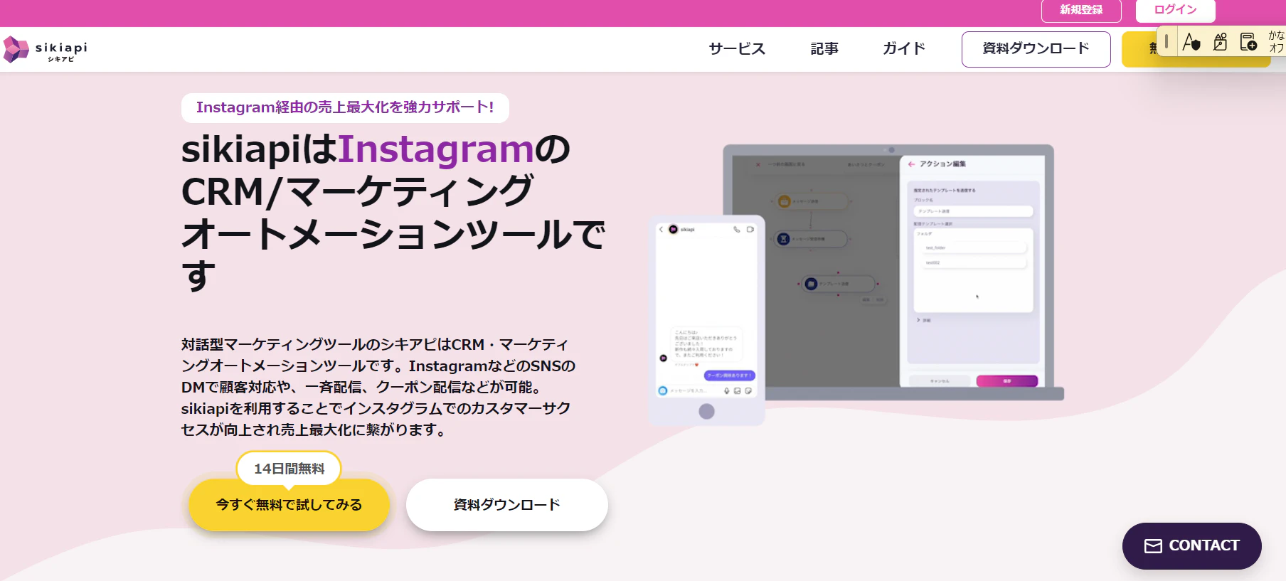 Sikiapiは、LINEやInstagramのSNSのDMで顧客に一斉配信や、クーポンの配信をおこなうマーケティングオートメーションツールのことです。